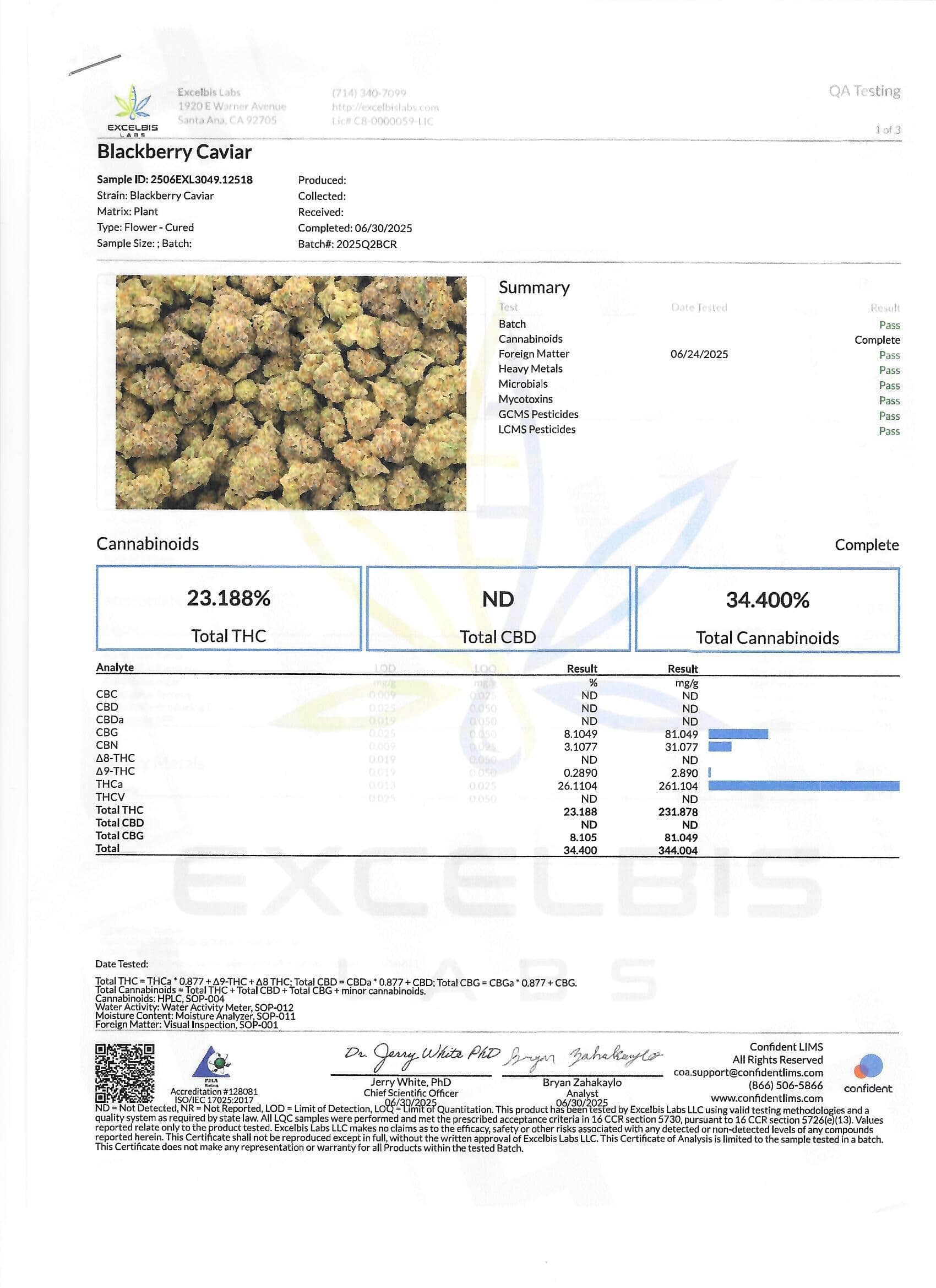 Blackberry Caviar is a THCa hemp strain with a beautiful coloration of greens and oranges that’s covered with a prominent frosty exterior. This strain is a balanced hybrid and the most notable effects are calming, hunger-inducing, and euphoria. Blackberry Caviar’s flavor profile consists of a wonderful cocktail of tasty berries with some slight pine undertones.Â