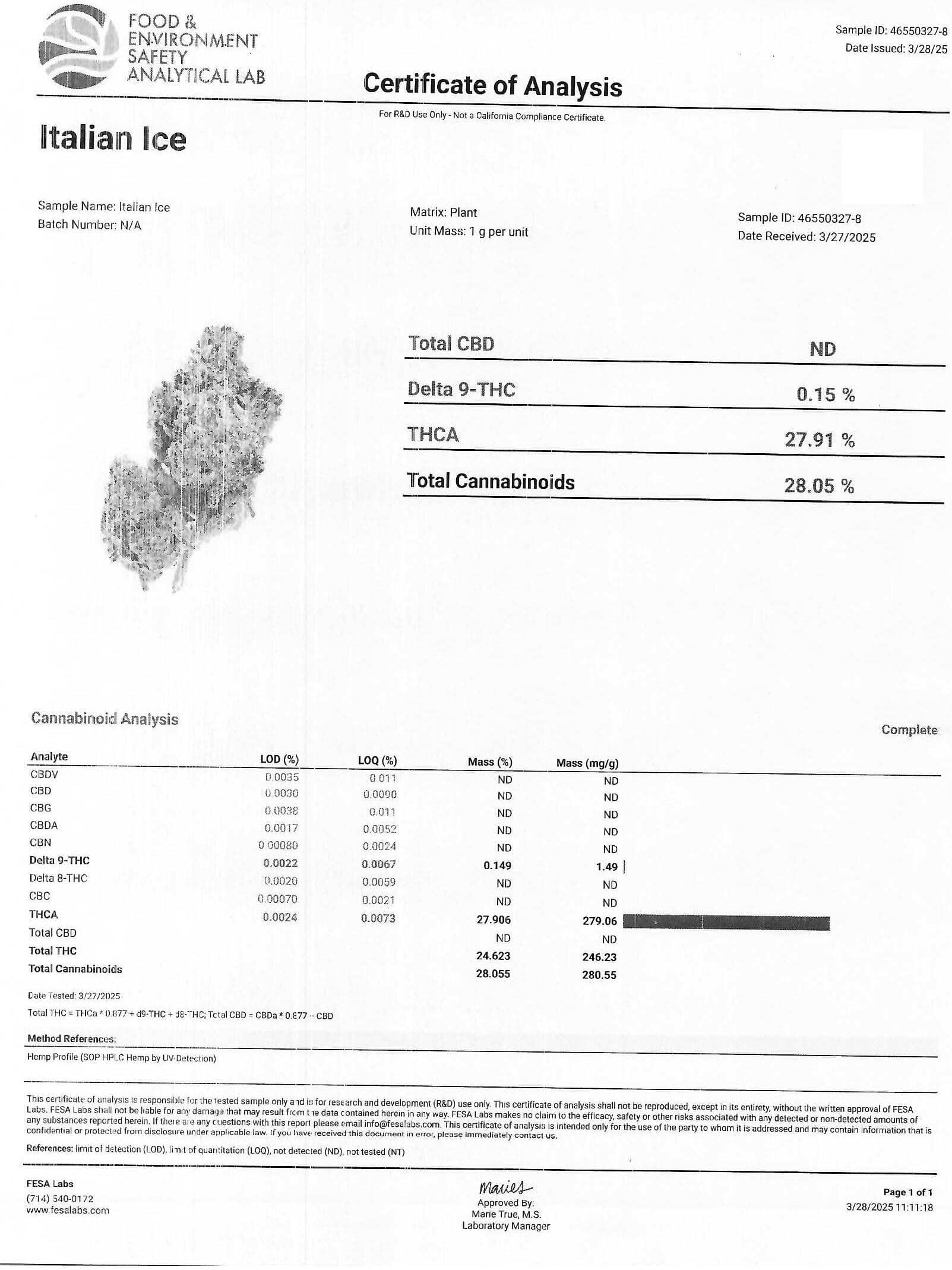 Summer is coming! Better cool off with some Italian Ice! This THCa hemp strain that lives up to its name, with it’s amazing flavor profile. When smoking and smelling this bud you’ll notice a sweet cereal flavor that tastes exactly like it smells! This strain is said to have a strong sativa effect, meaning the most common effects you’ll feel is energy, mood-lifting, and a surge of motivation. Italian Ice’s buds are covered in a mixture of light and dark greens with burnt oranges hairs poking out.
